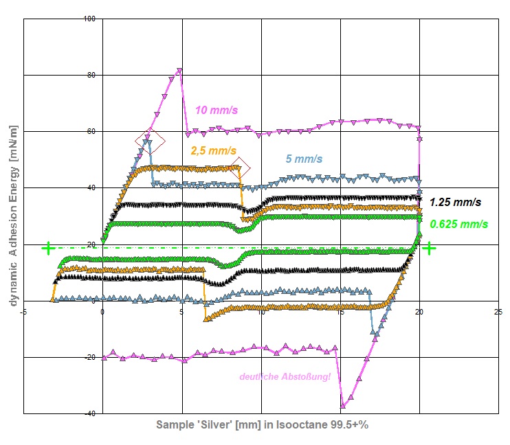 Nebst neuen Kraft-Effekten aus Dynamik und Materialschichtdicke, kann die Steiggeschwindigkeit des Meniskus und die Ausbreitung der Benetzung als Position der Dreiphasengrenze lokalisiert werden. Für den M4-Prüfbericht wird der jeweilige Messmodus mit statischer, dynamischer, teilbeschleunigter und konstant beschleunigter Dreiphasengrenzlinie ausgewertet; die autogenen Prüfberichte enthalten alle Angaben und dokumentieren Messungen beweiskräftig. Als Einführungsbeispiel zeigt Abb.1 ein Diagramm zum Verlauf der Adhäsionsenergie bei der Kontaktwinkelmessung an einem Kupferzylinder in Isooktan unter konstant beschleunigter Immersion/Emersion. Der Prüfbericht kann als PDF heruntergeladen werden (  PDF Prüfbericht (IDN°22513); für Fachleute sind diese kontra-intuitiven Ergebnisse besonders herausfordernd. - Immerhin, die ausgeklügelte IMETER-Technik ermöglicht die Beobachtung besonderer Phänome wie in Abb.1. Die "Oberflächen hat der Teufel gemacht", so wird der Quantenphysiker und Nobelpreisträger Wolfgang Pauli zitiert. - Und, um im Bilde zu bleiben, IMETER M4 ist das Vademecum zum systematischen Exorzissmus dämonischer Oberflächen