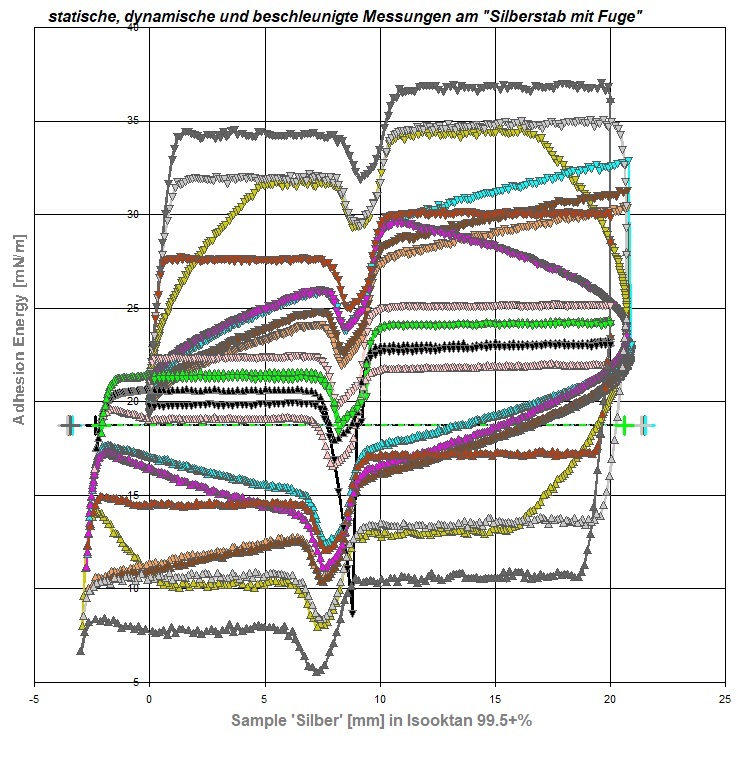accelerated Contact angele Measurements Cu/isooctane - speed-dependent discont.Abb.1a: Adhäsionsenergie bei beschleunigter Zwangsbenetzung. - Das Diagramm zeigt die Entwicklung der (scheinbaren) Adhäsionsenergie bei variierter Beschleunigung. Die Messwerte zeichnen einen hochsymmetrischen adv/rec-Verlauf, eine geschwindigkeits-über-proportionale Kraftänderung; einen Sprung oder Abbruch der Adhäsionsenergie bei einer bestimmten Energie bzw. Geschwindigkeit und eine Inversion der Hysterese.