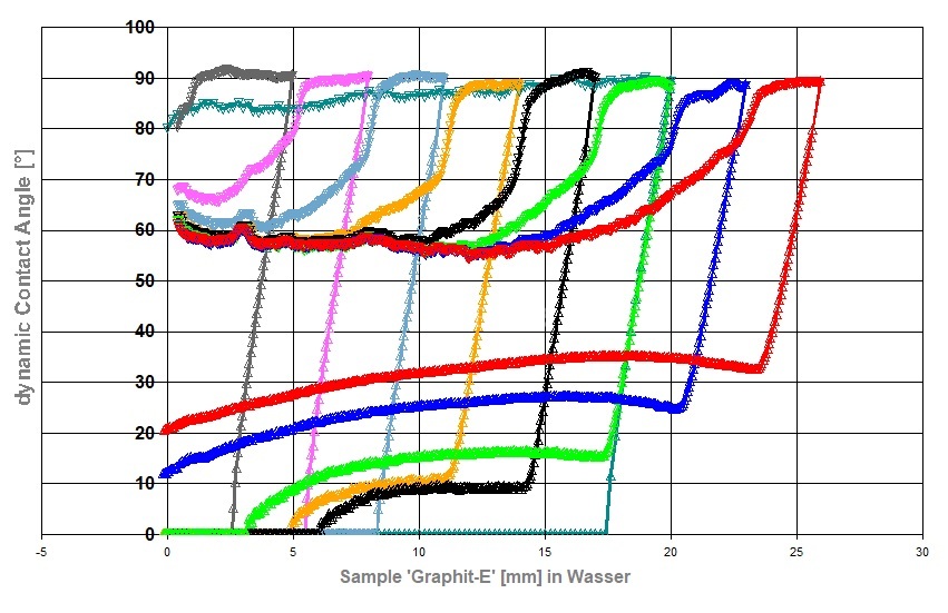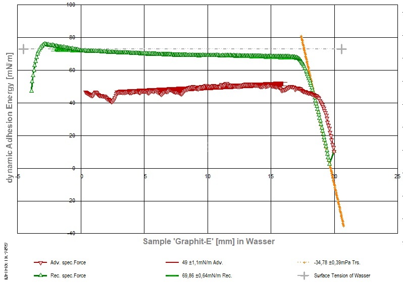Der Kontaktwinkel von Wasser auf Graphit sollte bestimmt werden, da kaum präzise Referenzwerte aufzufinden sind. Eine Graphit-Stabelektrode wurde in einer M4 Standardmess-Sequenz gegenüber Wasser analysiert. Es zeigten sich ungewöhnlich drastische Hystereseeffekte durch zuvor erfolgte Wasser-Benetzungen.