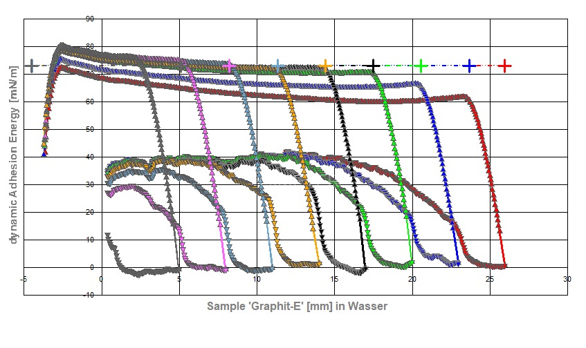In den Abb. 17. und 18. sind die Ergebnisse einer stufig durchgeführten Benetzung an einer zylindrischen Grafitelektrode zusammengefasst. Die beiden Darstellungen in Winkelgraden und Adhäsionsenergie zeigen Vorzeichenverkehrt selbe Verläufe an. Alle ªE - Messkurven zeigen einen vollständigen Verlauf auch da, wo kein Kontaktwinkel mehr vorliegt bzw. "θ = 0°". Ein quasi-Superwetting durch mikrostrukturierte Oberfläche ist wahrscheinlich. Übrigens, mit einem Klick auf ein Diagramm wird die Sequenz des Vorgangs vorgeführt.