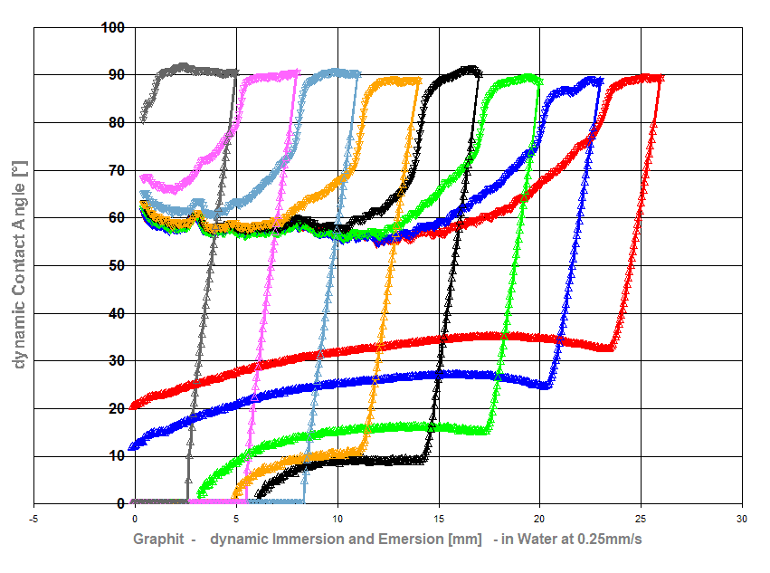 Die anfänglich extreme Kontaktwinkelhysterese schwächt sich mit der Behandlung ab. Kontaktwinkelangaben für Graphit können mit θ=30-50° nicht genau sein. Genauere Werte wären hier eher falsch, wenn nicht spezifiziert ist, unter welchen Umständen sie ermittelt wurden.