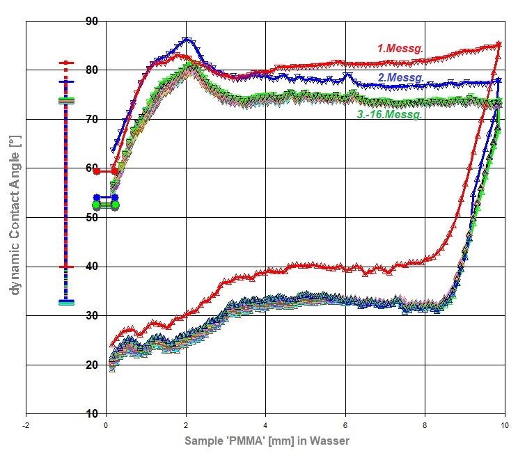 Links, die Abb.11 und Abb.12 dokumentieren Messungen an einem tadellos gereinigten isotropen Plexiglas-Stab (PMMA). In der Sequenz wurde die Kontaktwinkelabtastung 16-Mal wiederholt durchgeführt.