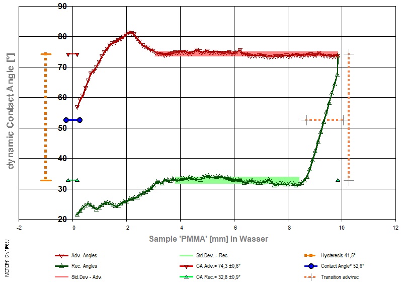 [Beispiel Oberflächenenergie PTFE] Die Diagramme unten zeigen am Beispiel der Messung an einer 1mm dicken PTFE-Platte in Abb.4, Rohdaten entsprechend dem Ausdruck "Wi-W°" (wcorr). Mit Abb.5, wird die Adhäsionsenergie (ªE) angezeigt und in Abb.6 die advancing- und receding- Kontaktwinkel entlang der Immersion. Ein Datenbank-Lookup identifiziert andere Messungen an gleichbenannten Proben ("PTFE-1mm") in der Datenbank. Die automatische Berechnung der Feststoff-Oberflächenenergie erfolgt per Mausklick und verlängert den jewiligen Prüfbericht um detaillierte Oberflächenenergieberechnungen und Diagramme wie Abb.7 und Abb.8. EInzelheiten können über das verlinkte PDF in Erfahrung gebracht werden: ► PDF- IMETER-M4 Messung an PTFE