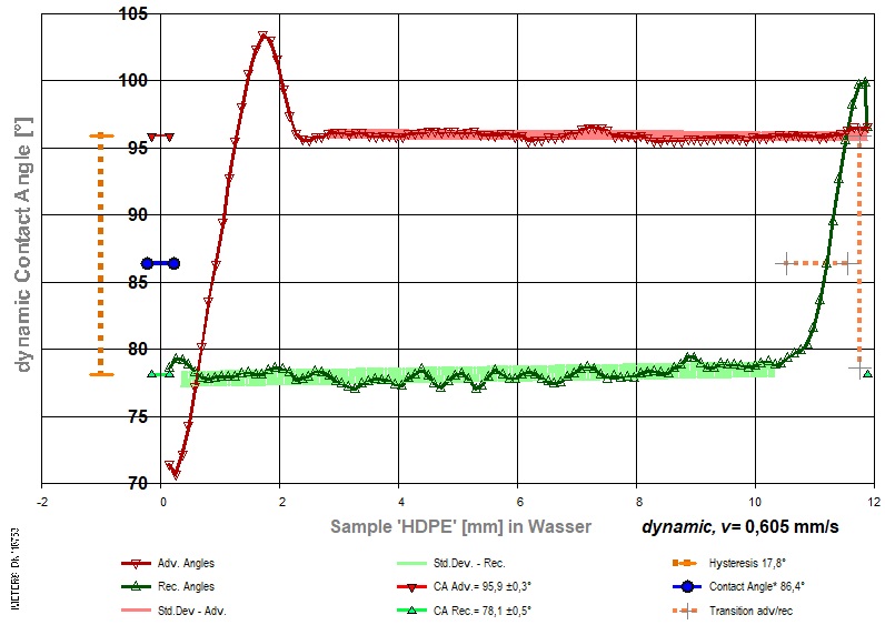 In der Mess-Sequenz wird die Benetzungs-Geschwindigkeit von 0.15 bis auf 5 mm/s zunehmend vergrößert. In Abb.9. ist das Kontaktwinkel-Diagramm zur Messung mit der Geschwindigkeit 0.6mm/s abgebildet. Dem Prüfbericht (►♦ IDN18753_HDPE-Wasser_SpeedSequenz) kann aus der tabellarischen Zusammenfassung der 14 Messungen entnommen werden, dass eine Geschwindigkeitsabhängigkeit vorliegt, die offenbar zu einer etwas schlechteren Benetzung bei steigender Geschwindigkeit der Triple Line führt. Die Benetzbarkeit fällt von B%5.7% auf 3.5%, wobei die Geschwindigkeit v~0.8mm/s einen lokalen Benetzungs-sprung auf B10% verursacht. Die Kontaktwinkel-Hysterese (CAH) durchläuft bei 0.6mm/s ein MInimum und steigt mit der Geschwindigkeit an.