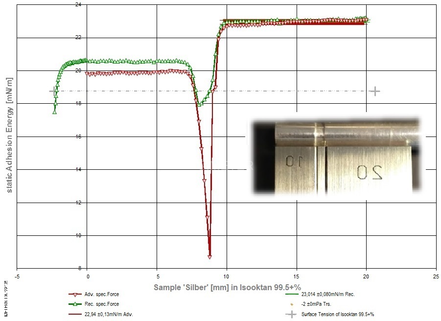 Es wurde ein Silberzylinder an einer Position mit einer scharfkantigen Vertiefung versehen. Sobald das total benetzende Fluid die Oberflächenstörung erfährt, zeigt die gemessene Adhäsionskraft den verursachten Effekt an. Silber, nicht etwa wegen des Pauli-Zitats in der Einleitung - eine gegenseitig gewiss inerte Stoffkombination wurde ausgewählt. Dem PDF-Prüfbericht ►♦ IDN°22105_Ag-Isookta_TLHM können alle Einzelheiten dieser statischen Messung entnommen werden. Im Text zu Abb.13. und 14. sind Aufbau und Ergebnis kurz beschrieben. Der dramatische Einbruch der ªE adv. beschränkt also immerhin das Feld möglicher Erklärungen für 'Superwetting-Phänomene' wieder auf anomale Kraftwirkungen an der Dreiphasen Kontaktlinie. Über Ursache und Herkunft der Überschuß-Adhäsion braucht also kein stirnseitiger Casimir-Effekt bemüht zu werden. Dann bleibt es bei dem sowohl für die Anschauung als auch für die klassische Theorie paradoxen Ergebnis, nachdem der Körperumfang nicht mehr Meniskusgewicht tragen können dürfte, als es die Oberflächenspannung erlaubt - es aber tut.