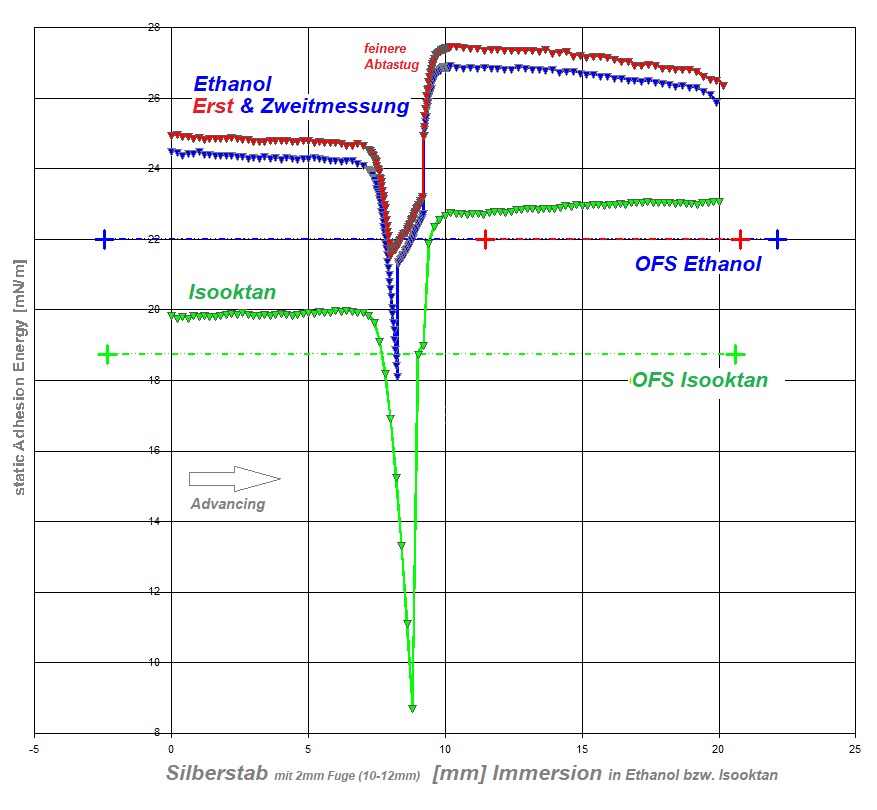Es wurde ein Silberzylinder an einer Position mit einer scharfkantigen Vertiefung versehen. Sobald das total benetzende Fluid die Oberflächenstörung erfährt, zeigt der Verlauf der gemessene Adhäsionskraft den verursachten Effekt an. - Silber, nicht etwa wegen des Pauli-Zitats in der Einleitung - gewählt wurde nur eine gegenseitig gewiss inerte Stoffkombination. Im Text zu Abb.13. und 14. sind Aufbau und Ergebnis kurz beschrieben. Dem PDF-Prüfbericht ►♦ IDN°22105_Ag-Isookta_TLHM können alle Einzelheiten dieser statischen Messung entnommen werden.